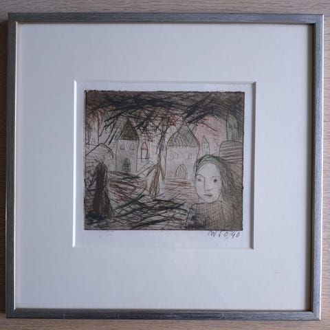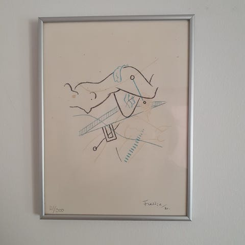 Opsat i mørkeblå ramme som passer med den blå farve i litografier. Fremstår i fin stand.
