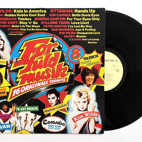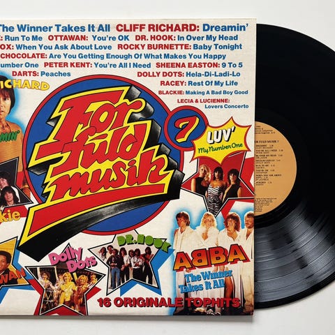 Various – For Fuld Musik 12 LP vinylplade med 16 originale tophits. Indeholder numre af kunstnere som Fr. David, Diana Ross, Laid Back, Hot Chocolate og The Killers. Coveret viser farverige billeder af kunstnerne.