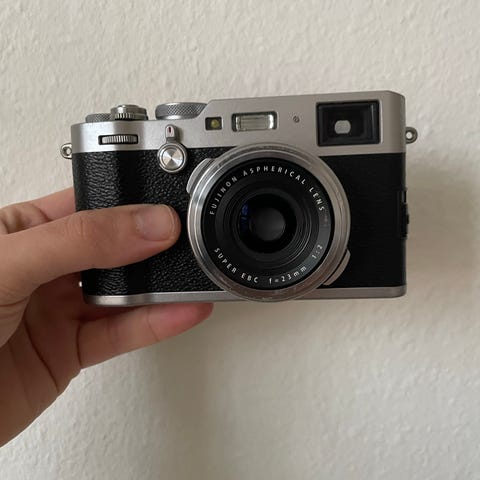 Fujifilm X-T100 kamera med indbygget søger og LCD-skærm. Kameraet har et kompakt design med manuel kontrolhjul og en rem til håndtering. Det er velegnet til både foto- og videobrug. Næsten ikke brugt. Kort og uv filter og taske og stativ medfølger. Købt i Foto C for 5700.