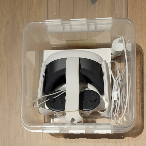 Meta Quest 3 VR-headset med 512 GB lagerplads. Headsettet leveres med to controllere og er designet til virtuel reality-oplevelser.