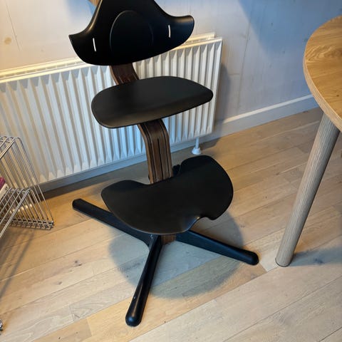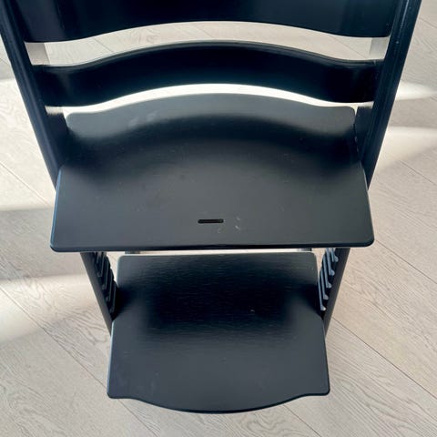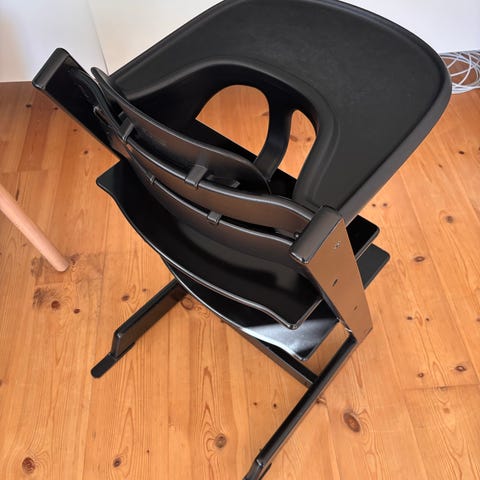 Stokke højstol i sort farve. Designet til børn med justerbar fodstøtte og sæde for komfort og støtte. Fremstillet i holdbart materiale, egnet til brug ved spisebordet.