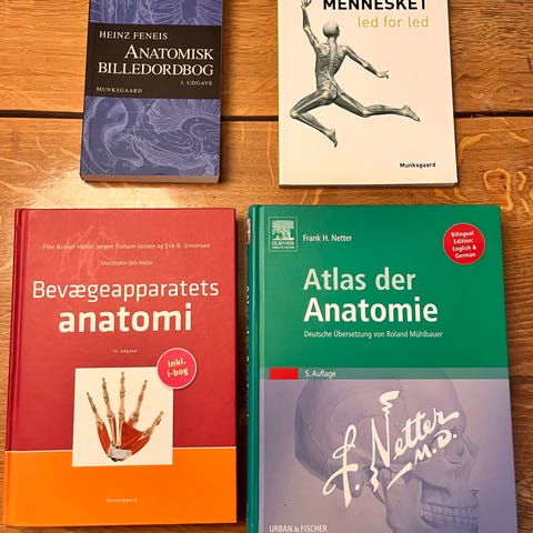 Sæt bestående af anatomibøger af M. F. Matthiesen, M. R. Krogsgaard, Klaus Poulsen & O. W. Petersen. Indeholder titlerne Ekstremiteterne & kropsvæggen, Thorax & abdomen, Hoved & hals samt Analyse af menneskets bevægelser. Bøgerne indeholder anatomiske illustrationer og beskrivelser af menneskekroppens forskellige dele.