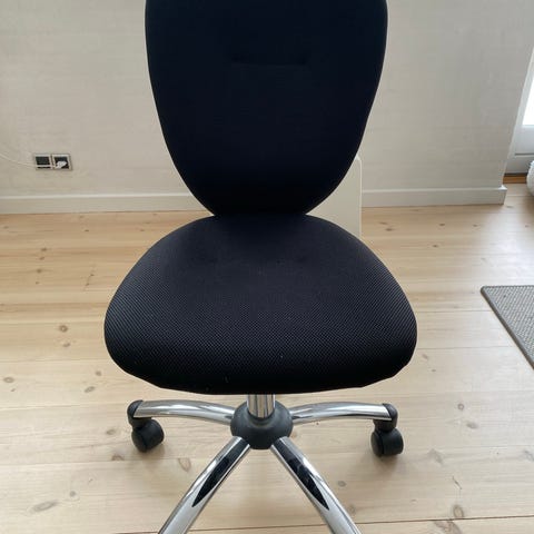 Kontorstol til skrivebord til førskolebarnet. Den kan helt sikkert gøres lidt mere ren, end jeg har fået gjort, men den er lidt ridset i kanterne. Fungerer dog upåklageligt👍. Måler 30x35 cm i siddefladen, er 37 cm i laveste højde og 51 cm i højeste højde.