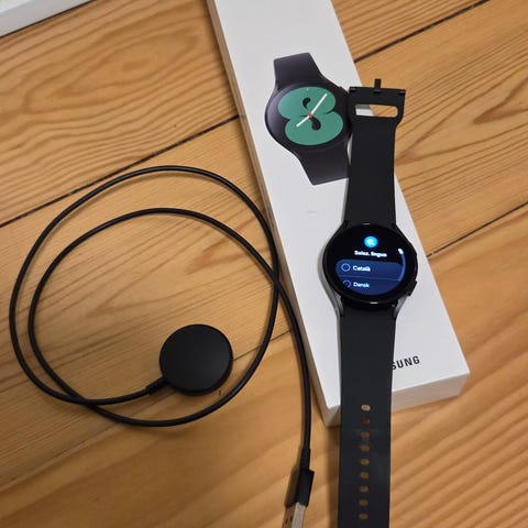 Samsung Galaxy Watch smartwatch på 46mm i sort. Uret understøtter Bluetooth og LTE-forbindelse, hvilket gør det muligt at modtage opkald, beskeder og data uden direkte forbindelse til telefonen, afhængigt af udbyderens tjenester. På billederne ses uret i original emballage samt flere sorte remme, som kan skiftes efter behov. Velegnet som smartwatch til hverdagsbrug med notifikationer, aktivitetsregistrering og tidsvisning.