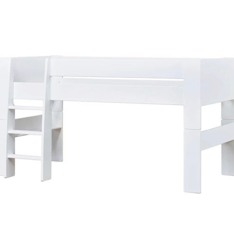 Hoppekids Højseng i hvidt træ. Højsengen er designet til børn og har en enkel, funktionel konstruktion med stige. Den er velegnet til at spare plads i børneværelset ved at give plads til opbevaring eller leg under sengen.