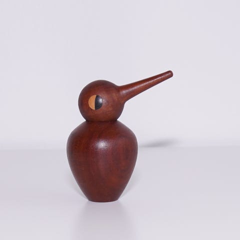 Træfugl dekorationsfigur lavet af egetræ. Figuren har en rund krop og hoved med udskåret øjne og næb. Velegnet som dekorativt element i hjemmet.