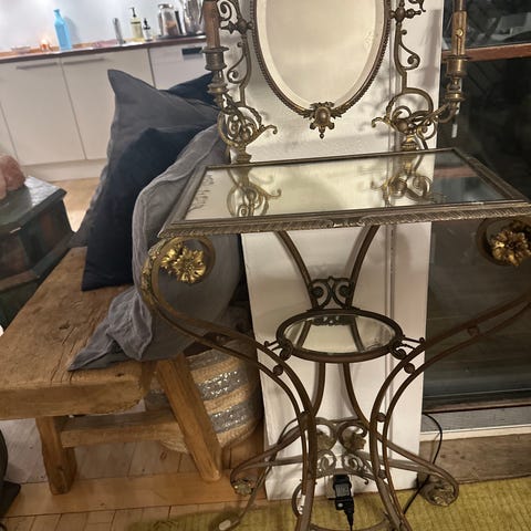 Et meget fint gammelt spejl som skal stå på et kosmetik bord til den fine dame eller dem som godt kan lide at få farve i ansigtet.