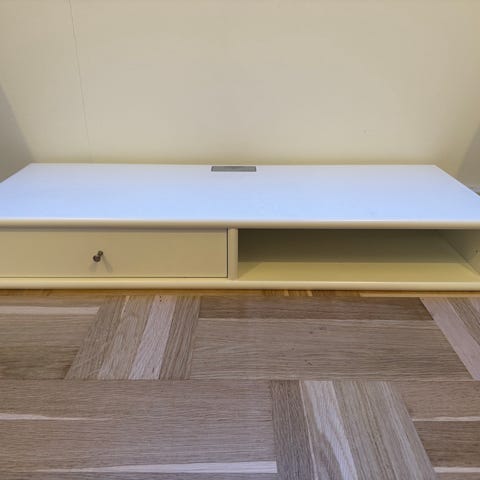 Mistral TV-bord med lille skuffe og opbevaringsrum med stof front. Købt i 2018 og har er nogle brugsspor og ridser, som ses på billederne, derfor sælges den billigt.