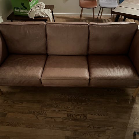 Sort kunstlæder. Der er en malerplet bag på sofaen, ellers er den helt fin. Puf 70x65.