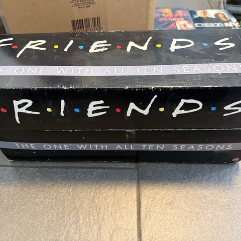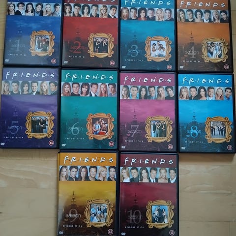 Friends The Complete Series DVD box set indeholdende alle ti sæsoner af tv-serien. Serien leveres i en sort opbevaringsæske med individuelle DVD-etuier for hver sæson. DVD'erne indeholder tv-seriens fulde episoder og kan bruges til afspilning på kompatible DVD-afspillere.