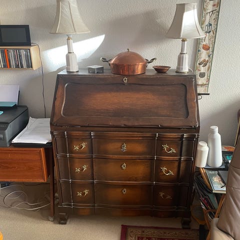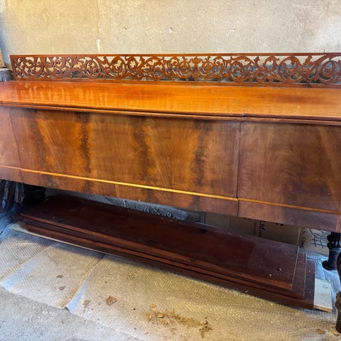 Antikt skænk i træ med dekorative udskæringer på front og top. Skænken har to skabe og fire skuffer, der giver opbevaringsplads. Møblet har en varm træfarve og klassisk design med søjle-lignende detaljer på siderne.