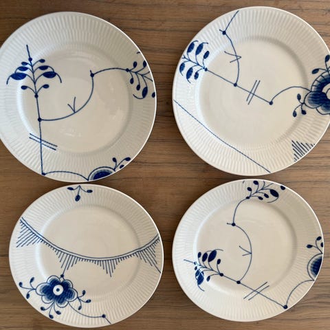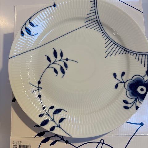 Royal Copenhagen tallerkener i blå mega. Tallerkenerne har et klassisk mønster med blå blomster og blade. Designet er karakteristisk for Royal Copenhagens porcelæn og egner sig til både hverdag og fest. 1.ste sortering uden skår.
