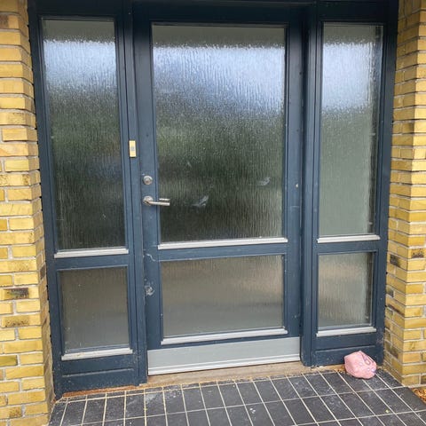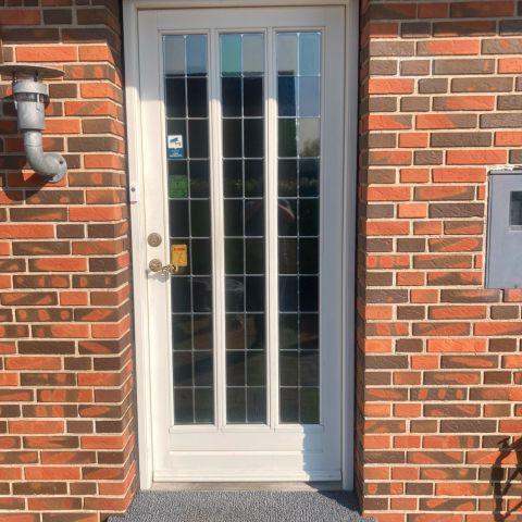 KRK yderdør med tilhørende karm og side parti. Døren har et kvadratisk vindue i øvre del og er designet med skrå paneler. Passer til brug som indgangsdør 207x 119 cm. Lukker indad og er venstre hængt.