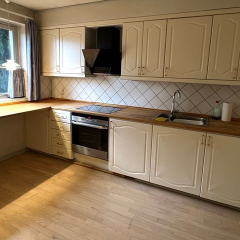Køkken med træskabe og hvide hårde hvidevarer