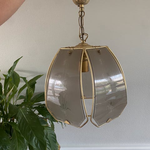 Matteret mundblæst opal hvid glas. Renoveret med nye stofledninger (nemt at montere længere ledninger) passer flot til trappeskakt, højt til loftet, læsehjørne. Skal hentes i Brønshøj.