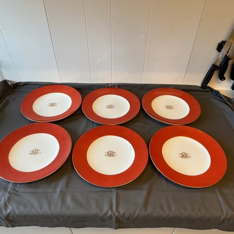 Porcelæn, Dessert tallerkner, Bing & Grøndahl, 6 Stk. Bing og Grøndahl dessert tallerkner nr. 28A med monogram sælges samlet for 75,00 kr. . De er hentet i Gråsten og har en diameter på 16 cm.