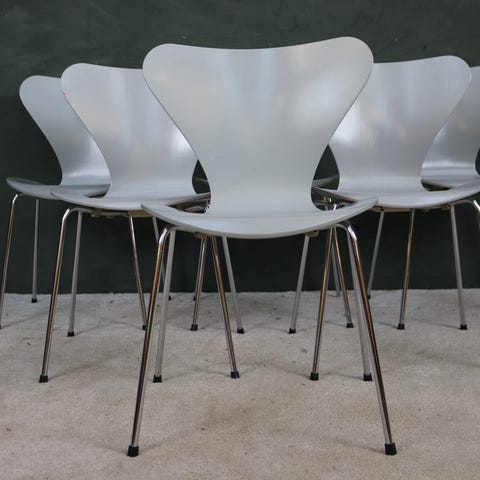 Arne Jacobsen 7er. Helt gammel model. 3 af dem er med blød ryg og stel er hellere ikke det bedste på alle. Men fedt med teak armlæn og de er gamle. 7 stk i alt. Pris 8000 kr samlet