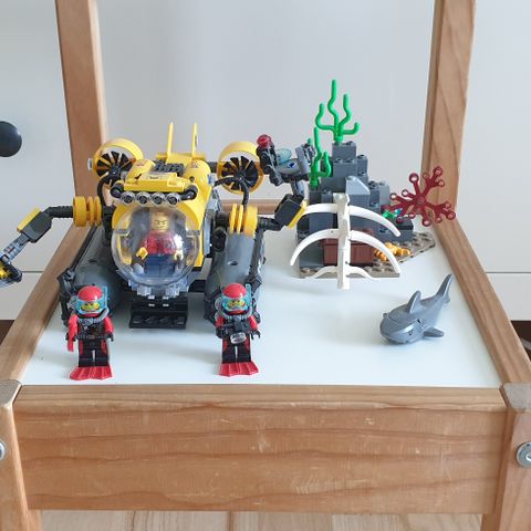 LEGO City Dykkerbåd legetøj med undervandstema, inklusive minifigurer og undervandsudstyr.