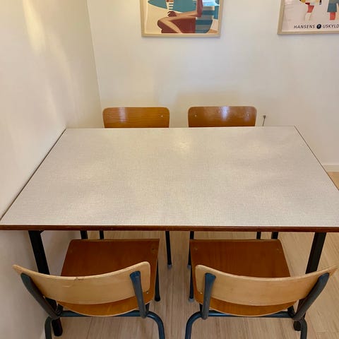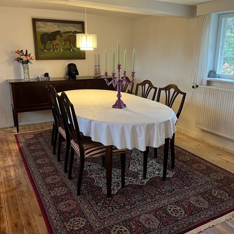 Helt arrangement med spisebord, 6 stole, dækketøjsskab, kommode.