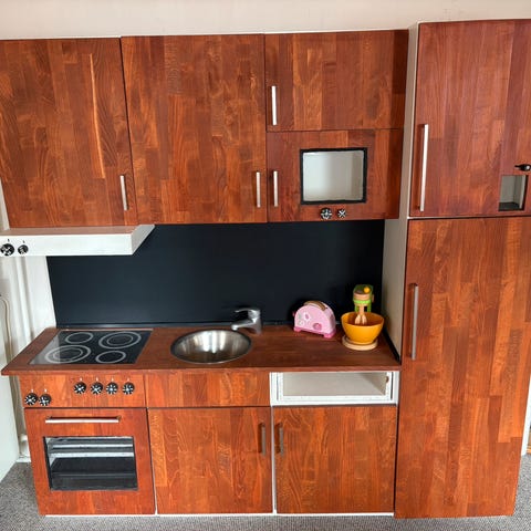 Fordele ved legetøjs køkken i træGiv barnet timevis af fantasifuld leg med et legekøkken i træ fra PROMIS. Sættet leveres med tilbehør og byder på flere realistiske elementer, der inspirerer til rolleleg i hjemmet. Det hvidt designede køkken har blandt andet køleskab/fryser, vask med vandhane, kogeplader, ovn samt åbne/lukke-knapper, der gør legen mere levende.Detaljer til inspirerende rollelegKøkkenet har overdel med mikroovn og hylder samt knager til redskaber. På fronten ses elementer som ovnlåge med vindue og skabsdøre, der kan åbnes. De tydelige mål gør det let at placere i børneværelset: højde ca. 84 cm, bredde ca. 82 cm og dybde ca. 28 cm. Et oplagt valg til børn, der elsker madlavning og rollelege sammen med venner eller søskende.Legekøkken: pleje og vedligeholdelseFor at bevare træets udseende bør legetøjet holdes tørt. Brug kun under opsyn af en voksen og undgå kontakt med vand for at forebygge skader på træet.Komplet træ-legekøkken med realistiske elementer og tilbehørFlot hvidt design med køleskab, ovn, kogeplader og mikroovnHylder og kroge giver plads til redskaber og legesagerTydelige mål – passer let ind i børneværelsetHoldbart valg til kreativ rolleleg og socialt samværProdukttype: LegekøkkenMateriale: TræCa. mål: H 84 cm × B 82 cm × D 28 cmEmballagetype: BoksPakkens mål: 89,5 × 34,0 × 16,0 cmPakkens vægt: 15,5 kgAdvarsel: Kun til brug under opsyn af en voksenVedligeholdelse: Undgå kontakt med vand