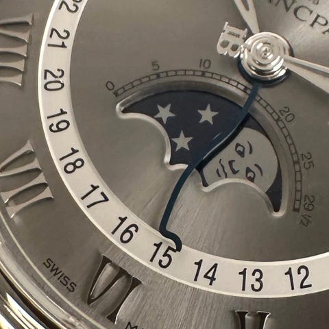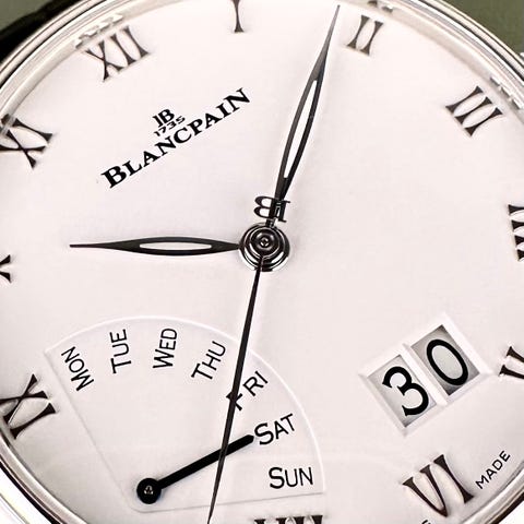 Blancpain Villeret Quantième Complet 6654A-1127-55B er et 40 mm ur i rustfrit stål med hvid skive, romertal og elegante, slanke visere. Uret har en fuld kalender med dag, dato, måned samt månefase, drevet af det automatiske calibre 6654.4 med 72 timers gangreserve. Det leveres med sort alligatorrem, foldespænde, safirbagkasse og 30 meters vandtæthed, hvilket gør det til et klassisk og elegant ur.