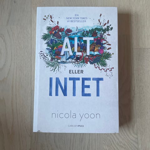 Nicola Yoon Alt eller Intet er en bog med illustrationer på forsiden. Bogen indeholder en historie, der omhandler temaer som kærlighed og livets udfordringer. FRIKØBT AF BIBLIOTEKET.