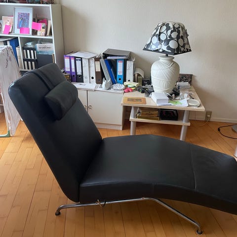 To liggestole i sort læderjakke. Kan justeres til både siddehøjde og liggehøjde.