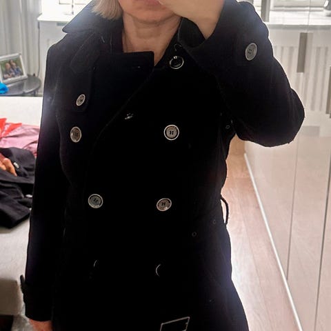 Vintage original Buberry, damefrakke i 100% uld. Smart og tidsløs med bælte, klassisk Burberry look og kvalitet . Str L (38/40) modellen på billedet er str 38. Smuk skovgrøn farve.