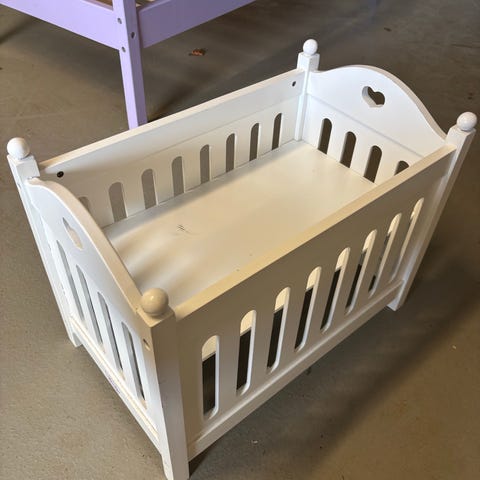 Dukkeseng i træ med to etager og lyserødt madrasbund. Sengen har dekorative blomster og hjerter på siderne.