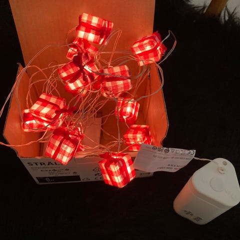 lyskæde til pynte hjem dejlig hyggelig lys kæde med 10 glitter pære form i sølv/guld og rød farve, bruger 2 AA batteri, kan bruges til alle anledning/party. kan hentes for 40 kr.