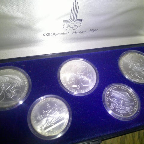 Olympiske Lege i Athen 2004 sølvmøntsæt. Sættet består af 24 sølvmønter med en opbevaringskasse og tilhørende mappe med papirer.