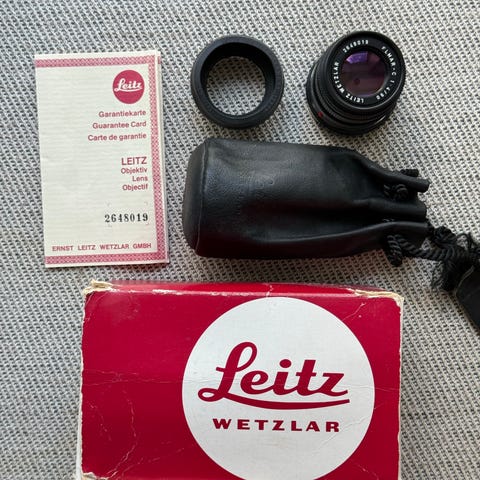 Modlysblænde, kapsler, samt en Novoflex (M til Sony FE) adapter.