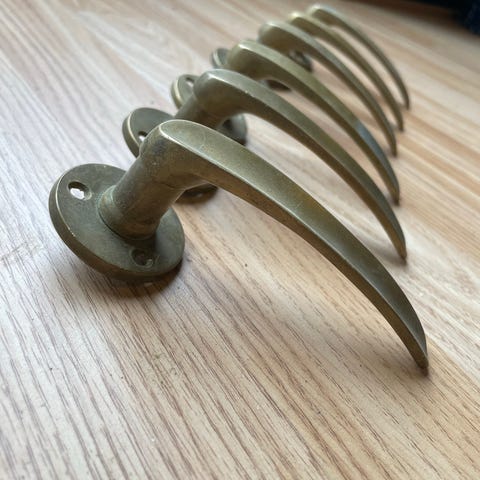 3x dørgreb i messing. Det ene dørgreb er lidt mere slidt end de andre (se sidste billede). Prisen er for alle tre.