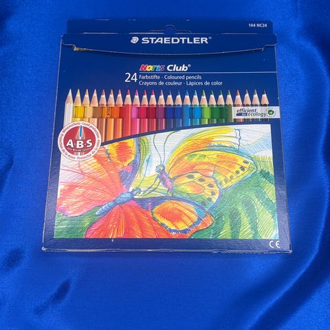 Sæt med 24 trekantede farveblyanter fra Staedtler i et praktisk plastiketui, der også kan foldes og stå selv, for at holde dit farvevalg pænt og organiseret. Blyanterne har et Anti-Break System med en hvid beskyttende belægning omkring den farvede kerne, der hjælper med at forhindre brud og gør dem mere modstandsdygtige. Derudover gør blyanternes form og den skridsikre overflade dem behagelige og mere ergonomisk at holde. Emballagen har været åbnet, men blyanterne har aldrig været brugt, så dette sæt kan nemt bruges som gave.