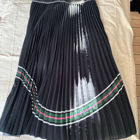 Elegant sort nederdel str. 10, svarende til en medium. lynlås og elastik i livet. Længde 65cm, slidser for, bag og i siderne giver ekstra vidde forneden.