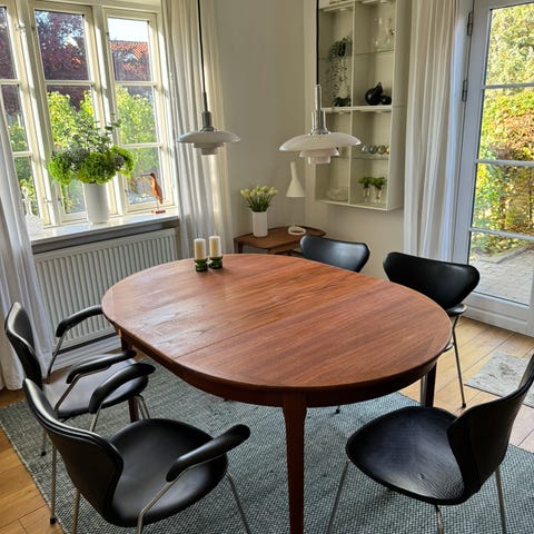 Flot velholdt rundt teaktræ spisebord med udtræk 2700kr. Mål 120 dia ( 148 udtræk) 71 høj. Desværre ingen indskudsplader til, dem må du selv fikse. Massive Teaktræ 4 Spisebordstol med bræt sæde og god sidde komfort 2000kr:. Samlet pris 4100kr.