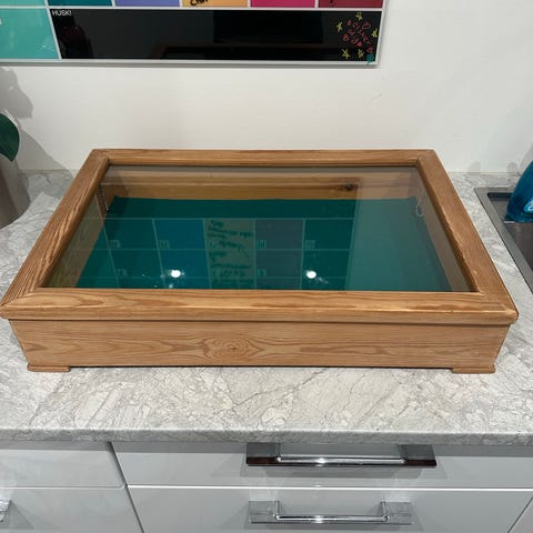 Den måler 100cm i længden, 63cm i dybden og 16cm i højden (på det højeste sted).