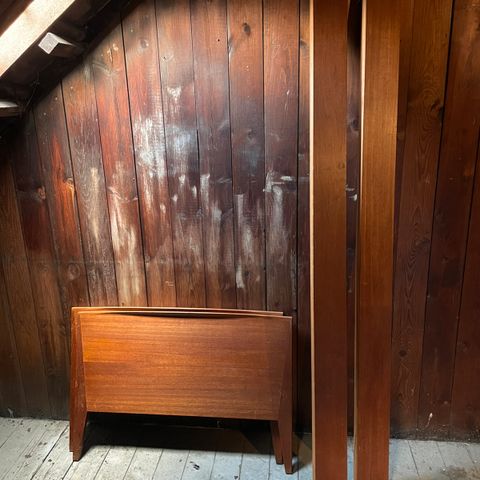 Norsk design teaktræ seng på messing fødder fra 70’erne. 188 l 80 b . 400kr . Flot billede i guldramme 200kr.