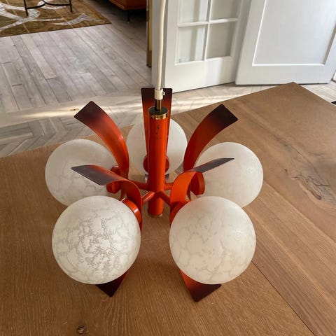 Den har en smuk konstruktion i orange/rødligt metal med smukke detaljer, hvor der på de 6 halvcirkelformede buer er monteret 6 elipseformede hvide opalglasskærme, matterede og med mønster.