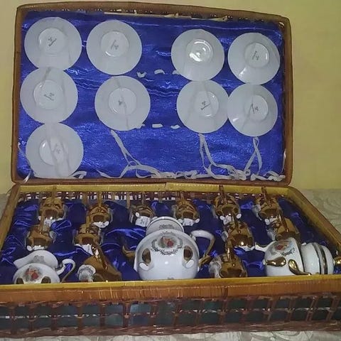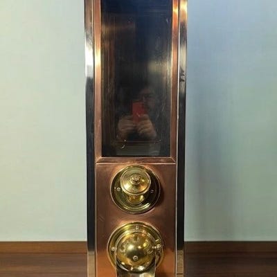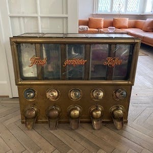 En gigantisk kaffe-dispenser til kaffebønner udført i porcelæn og med messing.