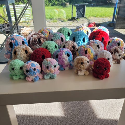 Vandmand hæklet i økologisk bomuld, med allergivenligt fyld, sikkerhedsøjne, kan maskinvaskes. Diameter 10 cm, fangarme op til 22 cm. Æsken medfølger ikke. Sælges for 75 kr. pp