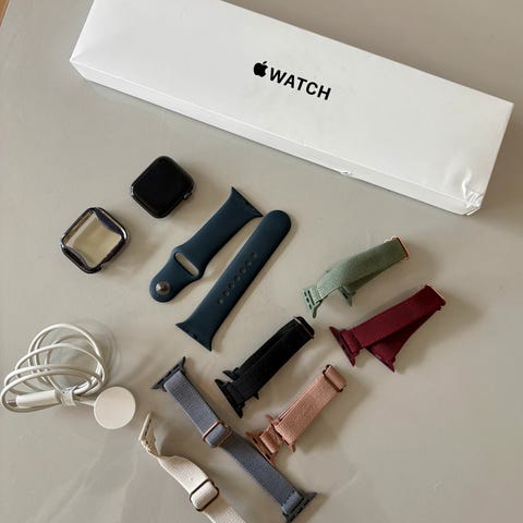 Medfølger: Original emballage, hvid ur-rem og lyseblå velcro ur-rem og Apple USB-A opladekabel. Strømadapter til opladekabel medfølger ikke.