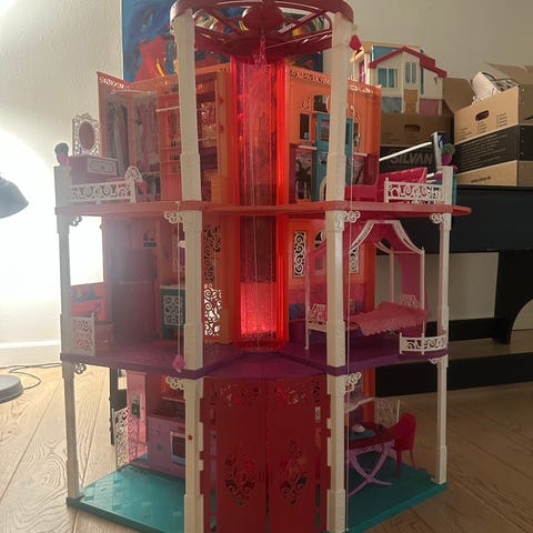 Super fint Barbiehus med møbler fra to huse og to elevatorer; en tøjelevatør i klædeskabet og en elevator til Barbie.