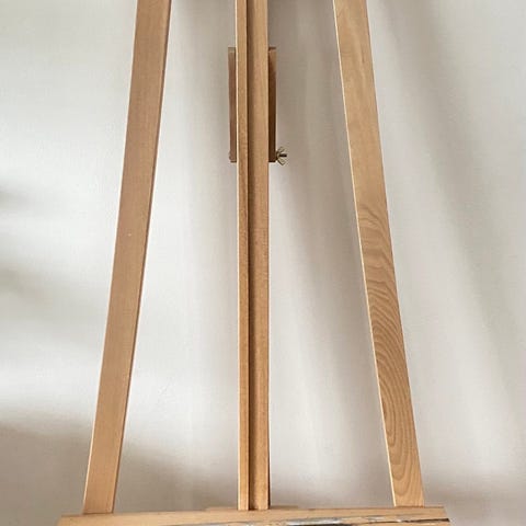 Træ staffeli til brug ved maling eller tegning. Fremstillet i træ med justerbare dele til at holde lærred eller papir i forskellige størrelser.