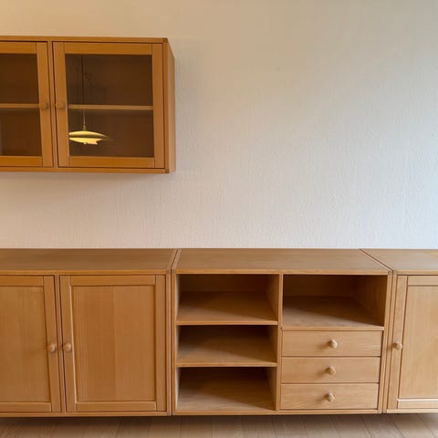 Funktionel og sæbebehandlet bøgetræsskænk i flot og tidløst design, klar til nyt hjem. Skænken har 4 rummelige skuffer i midten og skab med 1 hylde i hver side.