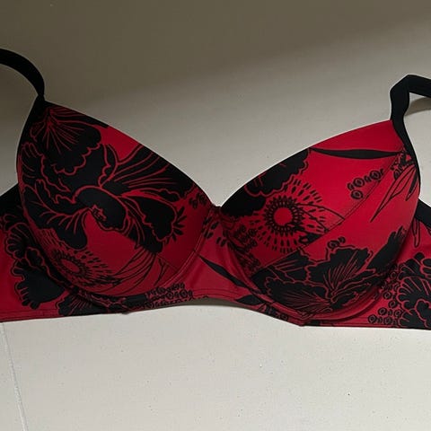 Formpressede skåle. Farven er rød med sort blomsterprint. BH'en har justerbare stropper og formstøbte skåle.