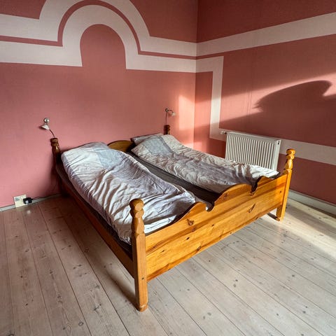 Retro seng i fyrretræ. Malet beige/guld. Har liggemålet 180x78 cm. Madras fra Wellpur i målene medfølger. Kan med fordel friskes op med ny maling. Passer godt som juniorseng.