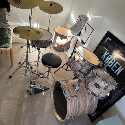 Stort Tama trommesæt fra start 80’erne med alt der skal bruges for at spille, inkl. gode bækkener, stativer/pedaler, nye skind og lækker stol.