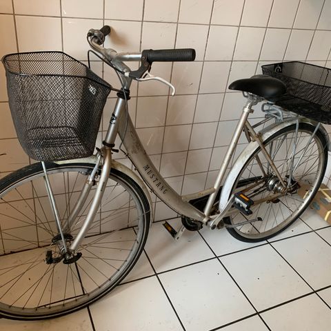 Mustang damecykel med lav indstigning - 7 gear - fod- og håndbremse - ringeklokke - cykelkurv - bagagebærer - godkendt lås - cykelcomputer Cateye Padrone Trådlås (Hvid).