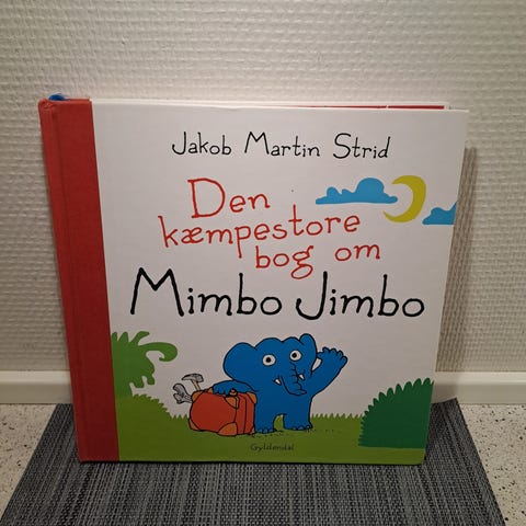 En lille kassette med fire Mimbo Jimbo papbøger for de mindste med hver sin lille historie om den lille blå elefant: